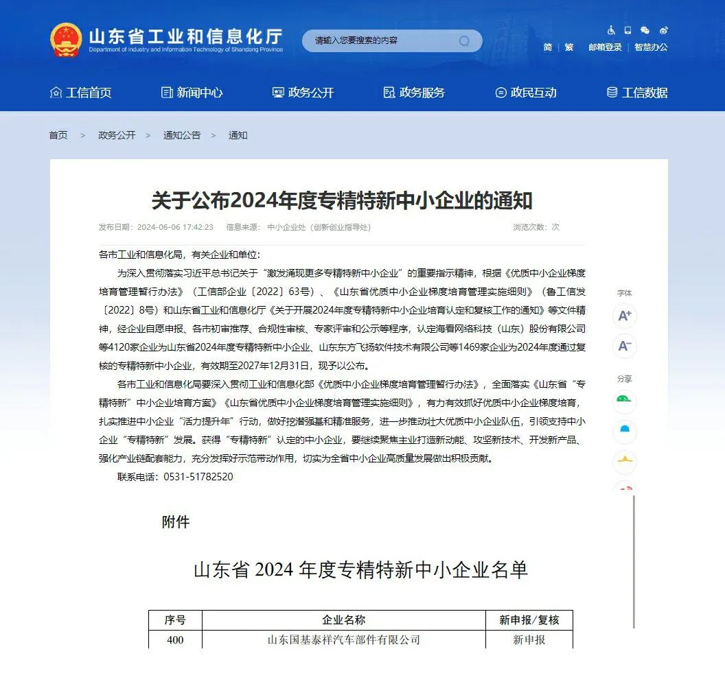 捷報,小鴨精工車橋基地(國基泰祥廠區)獲山東省2024年度專精特新中小企業稱呼