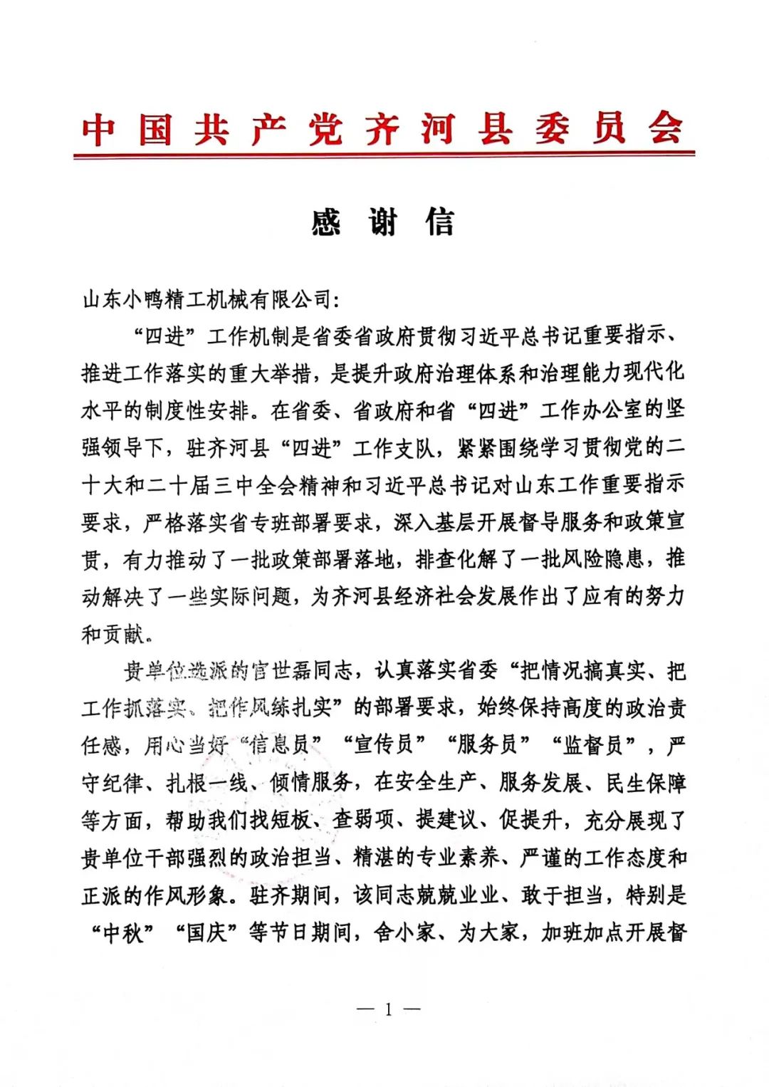 自5月4號起頭,小鴨精工遴派干部主干宮世磊同道到駐齊河縣“四進”使命支隊報道,展開為期6個月的省“四進”使命。使命時代,宮世磊同道當真落實省委“把環境搞實在、把使命抓落實、把風格練踏實”的安排請求,一直堅持高度的政治義務感,專心當好“信息員”“宣揚員”“辦事員”“監視員”,嚴守規律、扎根一線,傾情辦事,在寧靜出產、辦事成長、民生保證等方面,贊助齊河縣“四進”使命支隊找短板、查弱項、提倡議、促晉升,充實揭示了小鴨精工人激烈的政治擔任、高深的專業素養、松散的使命立場和正直的風格抽象。為此,齊河縣“四進”使命支隊特寫感激信一封,感激公司對“省四進”使命的鼎力撐持,感激官世磊同道的辛苦支出!